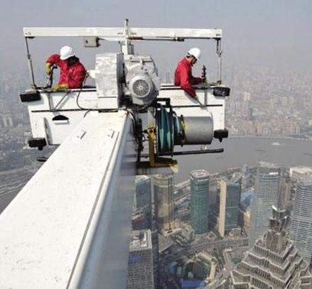 擦窗機(jī),用于建筑物或構(gòu)筑物窗戶(hù)和外墻清洗、維修等作業(yè)的常設(shè)懸吊接近設(shè)備。按安裝方式分為:輪載式、屋面軌道式、懸掛軌道式、插桿式、滑梯式等?! 〔链皺C(jī)的一般要求: 1)正常工作環(huán)境 (1)環(huán)境溫度:-20℃~+40℃ ?。?)環(huán)境相對(duì)濕度不大于90%(25℃) (3)電源電壓偏離額定值±5% ?。?)工作處陣風(fēng)風(fēng)速不大于8.3m/s(相當(dāng)于5級(jí)風(fēng)力) 2)擦窗機(jī)的設(shè)計(jì)荷載包括整機(jī)自重、額定載